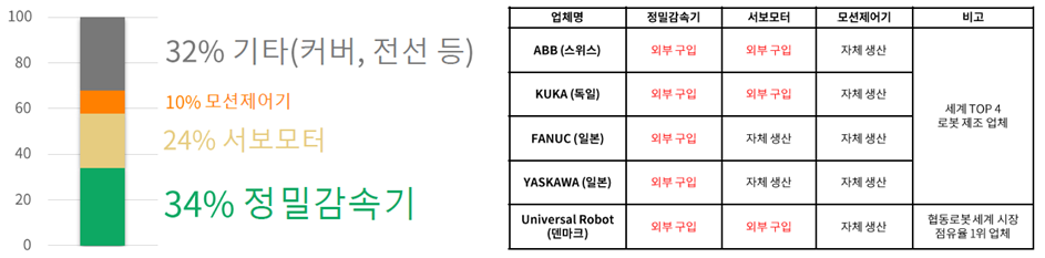 감속기에 대해서 상세히 설명하기에 앞서 로봇 산업의 밸류체인에 대하여 간단하게 설명하겠습니다. 일반인들이 생각하는 로봇 제조업체에 대한 이미지가 있을 것입니다. 실제 해당 로봇 제조업체는 사실상 로봇의 주요 부품의 조립 및 로봇의 시스템을 통합하는 일을 진행하며, 이 과정에서 필요한 감속기 등의 핵심 부품은 부품 제조업체로부터 조달받고 있습니다. 따라서 로봇 제조업체의 주요 기술적 요구 사항은 시스템의 통합이기 때문에 기술적 진입 장벽이 매우 높다고 볼 수 없으며, 일반적으로 어느 정도 규모가 있는 자본력에 의하여 영위 가능한 사업이라 할 수 있겠습니다. 이에 따라 대기업의 계열사나 중견 기업 이상의 자본력 규모를 갖춘 업체들이 많은 편입니다.