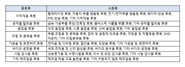 산업용 로봇은 각 기관마다 다양한 방법의 분류 체계를 가지고 있는데, 국내 로봇산업 특수분류에 따르면 하기와 같이 구분합니다. 다만 하기 구분 방법은 적용사례를 기반으로 되어 있어, 로봇보다는 설비에 가깝다는 평이 있습니다. 또한 하기 분류 방법 중 용접 및 표면처리용 로봇 2개를 제외한 나머지 분류는 물리적으로는 같은 작업을 수행하는 로봇으로 볼 수 있습니다.