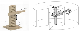 ④ 원통형(Cylindrical): 수직 이동을 가능하게 하는 2개의 선형 조인트와 수평 이동을 가능하게 하는 하나의 회전 조인트로 구성된 로봇입니다. 보통 원통 형태의 범위에서 작업을 진행합니다.