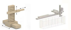 ② 직교좌표형(Cartesian): 직교 좌표계를 기반으로 X(오른쪽 및 왼쪽), Y(정방향 및 역방향), Z(위아래)의 세 축에서 직선 이동하는 로봇입니다. 갠트리, xyz 또는 직선 로봇이라고도 불리며, 작업 범위가 직사각형의 형태를 가지게 됩니다. 높은 강성 구조와 균일한 제어 특성을 가지기에 제어가 간단하고, 위치에 따른 반복정밀도가 우수한 편이라고 합니다. 비교적 큰 작업 영역을 가지는 작업에도 적합하며, 천장의 공간을 최대로 활용한다는 강점이 있습니다. 주로 공장의 물류 반송, 기계 내부의 이동 작업, 전자제품의 조립, 용접, 납땜 작업 등에 이용됩니다. 앞서 말했듯이 관절형 로봇 다음으로 많은 로봇입니다.