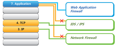 가령, Network Layer에서 기동하는 일반 방화벽은 80번과 443번 포트를 일괄적으로 열어 두는 것을 rule로 정했는데, 이는 http와 https의 포트 번호에 해당합니다. 따라서 http나 https의 프로토콜을 통해 들어오게 되는 데이터 통신은 일반적인 방화벽에서는 그 세부 내용을 탐지할 수 없게 됩니다. 또한 Transport Layer에서 기동하는 IDS나 IPS의 경우 방화벽과 달리 http, https에 대한 보안능력이 있기는 하나 미흡하며, 역시 https를 포함한 SSL 통신의 경우 암호화된 패킷을 분석할 수 없어 관련 방어 능력이 없습니다. 또한 시그니처 방식(이미 수집된 악성코드의 특징을 분석해서 해당 악성코드의 특징을 요약하는 것)으로만 탐지하므로 지속적인 업데이트가 필요하며 세부 정책 구현이 불가능한 단점은 그대로 존재합니다.