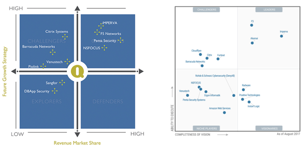 실제 국내 업체의 해외 위상에 대해 살펴 본 내용은 다음과 같습니다. 프로스트&설리반에서 2015년에 발표한 아시아 태평양의 WAF 시장에 관한 자료에서 국내 기업 중 펜타시큐리티가 유일하게 M/S와 성장율이 우수한 업체로 등재된 바 있습니다. 또한 Gartner가 몇몇 특정한 기술 산업에 대해 1-2 년마다 새롭게 갱신하는 매직 쿼드런트 보고서 2017에 따르면, WAF의 리더 업체로는 임퍼바, F5 네트웍스, 아카마이가 있으며, 국내 기업으로는 펜타시큐리티가 유일하게 등재되어 있습니다.