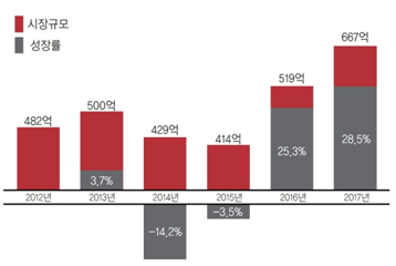 그러나 2015년경부터 시장에 변화가 나타나기 시작합니다. 웹 공격, 개인정보 유출사고가 점점 늘어나고, 개인정보 유출 시 막대한 과징금 또는 대규모 소송에 휘말릴 수 있다는 점이 부각되면서 WAF에 대한 수요가 늘기 시작한 것입니다. 더불어 머신러닝 등 새로운 기술이 접목돼 성능상의 이슈를 보완한 차세대 WAF와, 클라우드 환경에서 사용할 수 있는 서비스형 보안(SECaaS) 형태의 솔루션이 등장하면서 시장이 확대 됩니다. 아래 그래프를 보시면 2012~2015년까지 횡보하던 국내 시장이 2016년부터 점차 커지는 모습을 보실 수 있겠습니다.